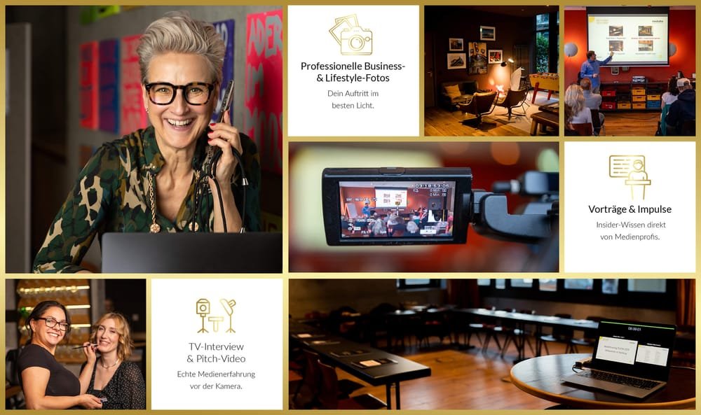 Bei diesem exklusiven Event trainierst Du mit Medien-Profis, stehst vor Kamera und Mikrofon – und gehst mit professionellen Interviews, Fotos, Videos, einem klaren Content-Plan und Deinem persönlichen Medienprofil nach Hause.